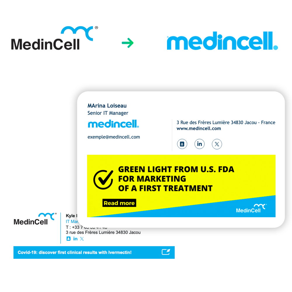 Lorsque Medincell a fait évoluer son logo et son image de marque, Signitic a permis à l'équipe communication de déployer automatiquement la nouvelle identité dans les signatures email de l'ensemble des équipes.