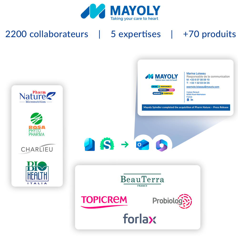 Le groupe Mayoly regroupe plus de 2200 collaborateurs répartis sur 5 pôles d'expertise et 70 marques. Il y a véritable enjeux à pouvoir automatiser la gestion des signatures email des différentes marques et équipes.