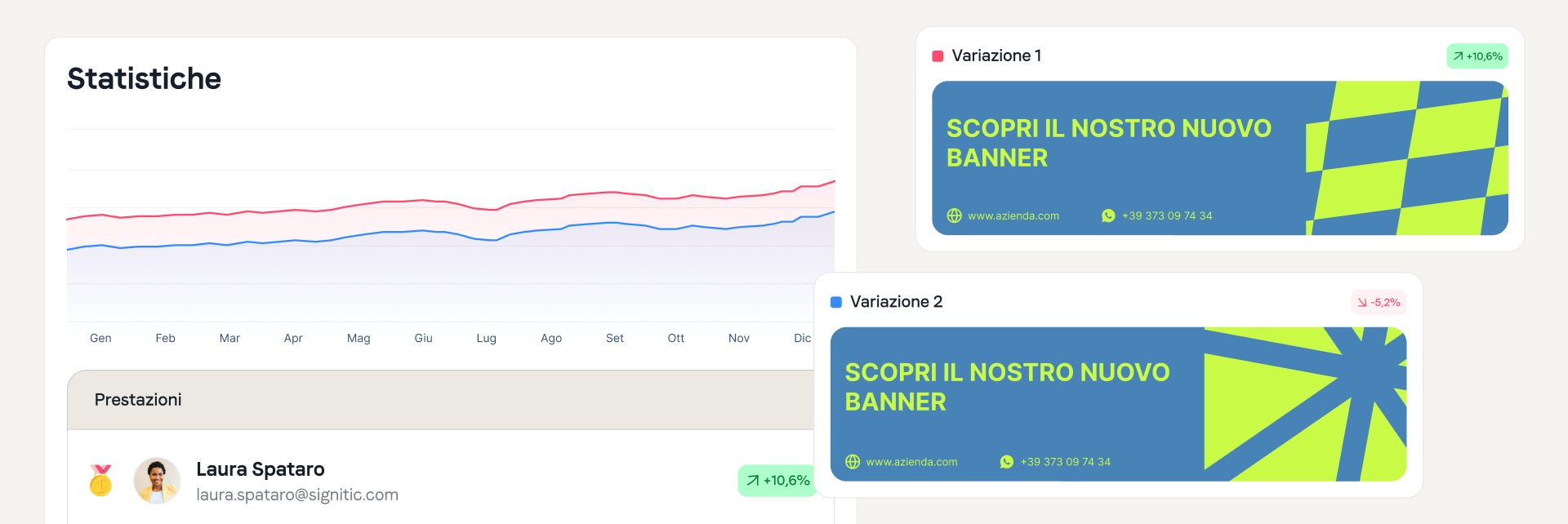 Confronta l'efficacia dei tuoi banner in tempo reale. Identifica gli elementi visivi che generano il maggior coinvolgimento e prendi decisioni sulla base di dati concreti.