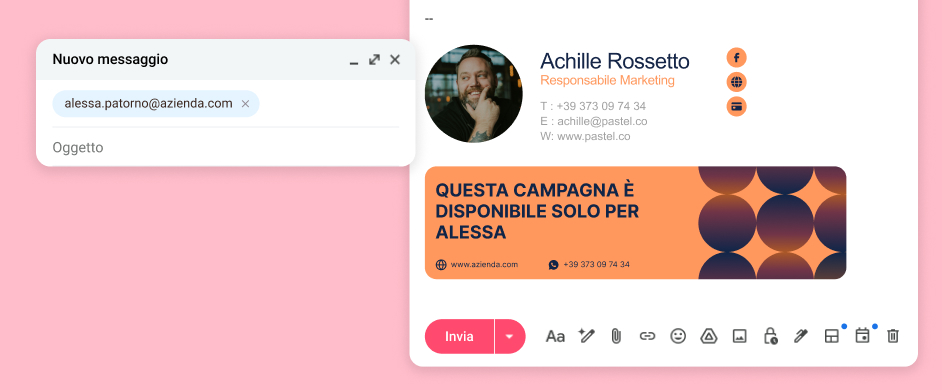 Crea, pianifica e trasmetti campagne personalizzate e mirate tramite la tua firma e-mail, per promuovere le tue offerte, eventi o notizie.