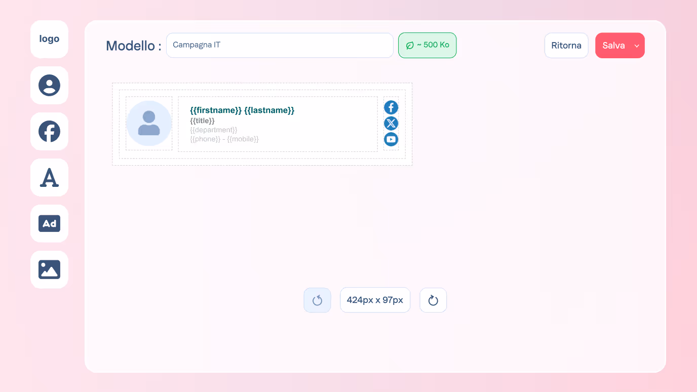 Grazie al nostro editor drag & drop, crea firme email potenti e personalizzate. Aggiungi loghi, link o social network per garantire una perfetta coerenza dell'immagine, fino alla firme email.
